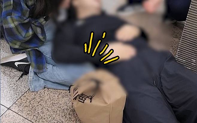 승강장 바닥에 젊은 여성 한명이 철퍼덕 주저앉아 있습니다. 무릎 위에는 백지장처럼 하얗게 질린 중년 여성의 얼굴이 보입니다.