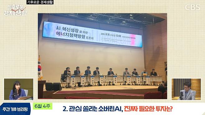 ◇ 백승민> 그렇습니다. 인공지능 뒤에는 데이터센터가 있고 그 데이터센터 뒤에는 전력 인프라가 있잖아요. 폭발적으로 늘어날 전력 수요를 어떻게 할 건지 전문가들도 관심이 많은데요. 바로 지난주에 국회 토론회가 있었습니다. 'AI 혁신성장을 위한 에너지정책방향' 토론회였는데요. 지난해 노벨경제학상 수상자인 대런 애쓰모글루가 기조연설을 한 토론회였는데요. 저도 갔거든요. 저의 관심은 토론회 좌장이신 홍종호 교수님께 있었어요. (웃음)