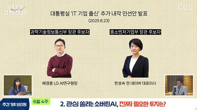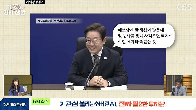 ◇ 백승민> 지난주 이재명 대통령이 첫 산업 현장 방문지로 울산 인공지능 데이터센터를 찾았습니다. 기업인들과의 간담회에서 소버린 AI 개발의 필요성을 강조했는데요. 선거 때 챗GPT가 있는데 왜 소버린AI를 개발해야 되냐, 낭비다와 같은 공격이 들어왔었죠. 이런 평가에 대해 베트남에 쌀 생산이 많은데 왜 농사를 짓냐, 사 먹으면 되지, 이런 얘기와 똑같은 거라고 지적하면서 소버린 AI 개발 의지를 강조했어요. 그래서 100조 원의 투자금이 어디로 집중될지 눈치 빠른 분들은 벌써 감을 잡으시지 않았을까 생각이 들더라고요.