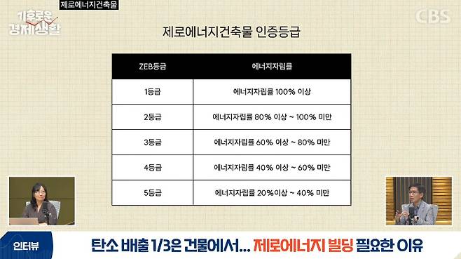 ◇ 이명주> 1등급이 돼야 소비량 대비 생산량이 100%가 되는 거잖아요. 그래서 120%가 되면 플러스 등급이 주어집니다. 그렇다면 1이 되고도 20%를 더 생산했을 때 플러스 등급이잖아요. 올해 6월부터 하는 민간 공동주택은 제로에너지 기준이 아니고 제로에너지 수준이에요. 그러면 5등급 수준이니까 5등급이 안 된다는 거죠.