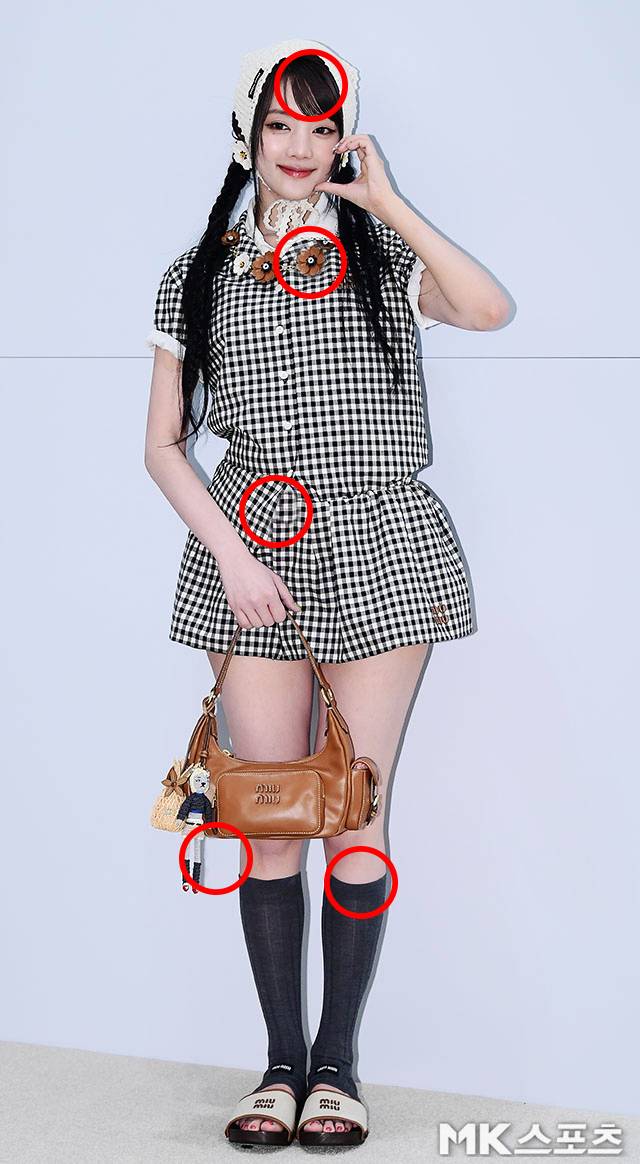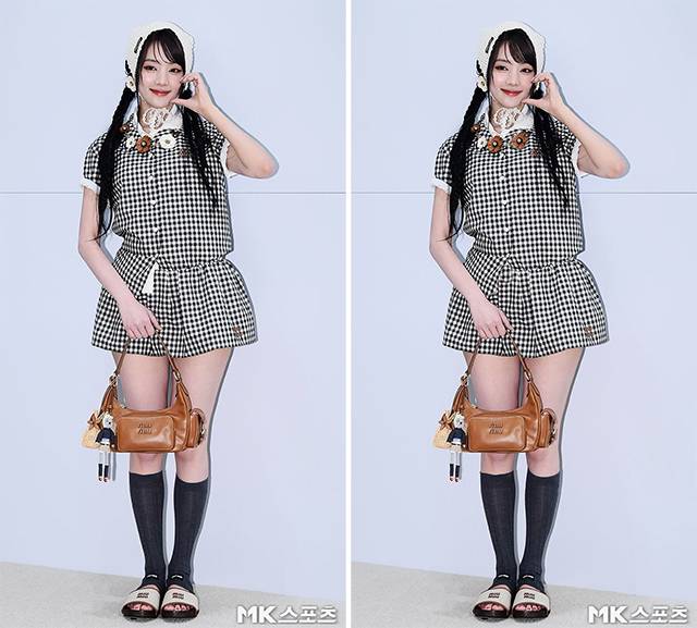 이날 행사에서 민니는 흑백 깅엄 체크 셋업에 니트 보닛을 매치해 마치 동화 속 깜찍한 소녀를 연상케 하는 패션을 선보였습니다.