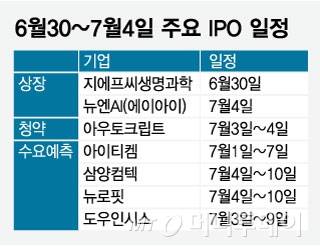 투자자들의 관심은 이제 올해 하반기 예비 상장사에 쏠린다. 이번주(6월30일~7월4일) 상장하는 기업은 지에프씨생명과학과 뉴엔AI(에이아이) 등 2곳이다.