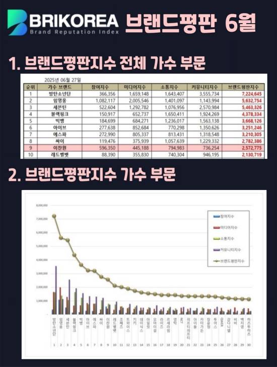 최근 한국기업평판연구소는 5월 27일부터 6월 27일까지 가수 브랜드 빅데이터를 분석한 결과, 이찬원이 브랜드평판지수 2,572,775를 기록해 전체 9위에 올랐다고 밝혔다.