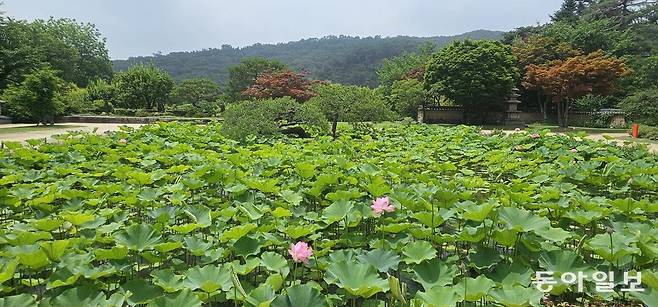 뒤늦은 관람이어서 오히려 뜻밖의 기쁨이 있었습니다. 한국 정원의 우아함을 대표하는 호암미술관의 정원, 즉 희원(熙園)의 초여름 풍경을 마주했거든요. 지금 중앙 연못에는 분홍 연꽃이 막 피어나고 있어요. 프랑스 예술가 장 미셸 오토니엘의 ‘황금 장미’와 ‘황금 목걸이’ 작품이 있는 관음정 앞 연못은 노랑어리연꽃이 수면을 덮어 소박하면서도 찬란합니다. ‘검이불루 화이불치(儉而不陋 華而不侈·검소하되 누추하지 않고 화려하되 사치스럽지 않다)’라는 말이 절로 떠오르네요.