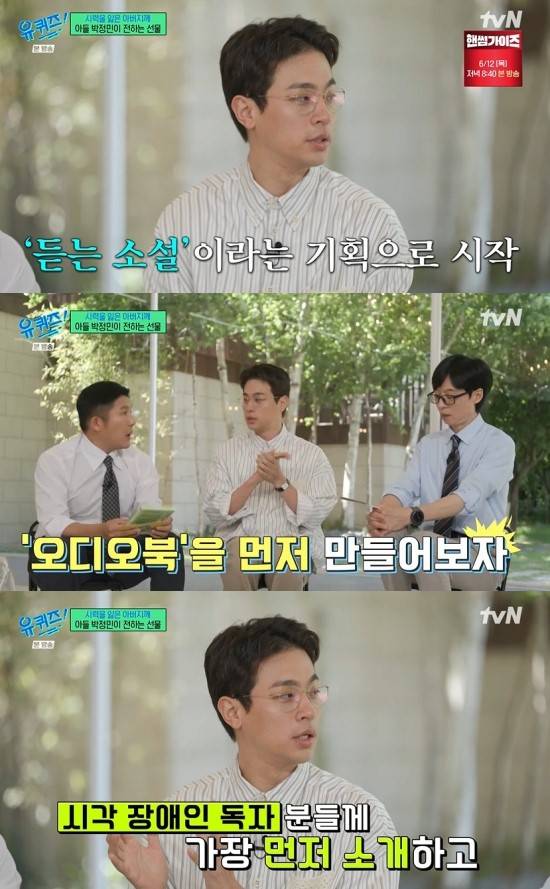 오디오북 '듣는 소설 프로젝트'를 시작한 박정민은 소설가 김금희와 의기투합해 장편소설 '첫 여름, 완주'를 출간했다. 독서에서 소외되기 쉬운 시각 장애인을 고려한 작품으로, 염정아와 박준면, 고민시, 김도훈, 최양락 등의 재능 기부로 완성됐다.