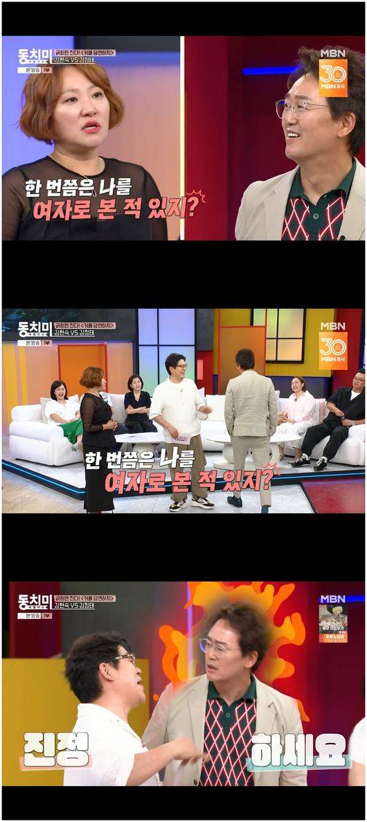 김정태는 “여러 언니라니? 지금 와서 결혼 전 이야기를 하면 뭘해?”라며 선을 그으려고 했으나, 김현숙은 “원래 이상형이 일관되긴 하더만? 언니 만나기 전에 만난 한양대 여자를 언니 알고 있지?”라며 선을 넘었다. 김정태는 “미X 거 아니야?”라고 묻더니 “너, 최근에 만나는 남자 있지?”라고 반격해 김현숙의 말문을 막았다./osen_jin0310@osen.co.kr