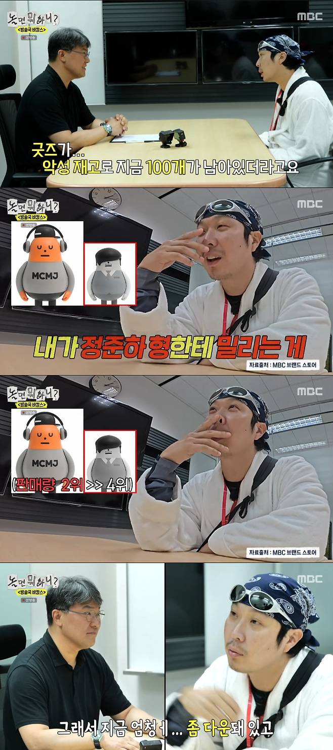 앞서 하하는 MBC 기념품샵에서 유재석의 굿즈는 품절인 반면, 본인은 100개 정 재고가 남았음을 확인했던 바. 하하는 "굿즈가 악성 재고로 100개가 남아있더라. 근데 이제 내가 정준하 형한테 밀리는 게 말이 안 된다고 생각했다. 그래서 지금 엄청 다운돼 있다"고 털어놨다.
