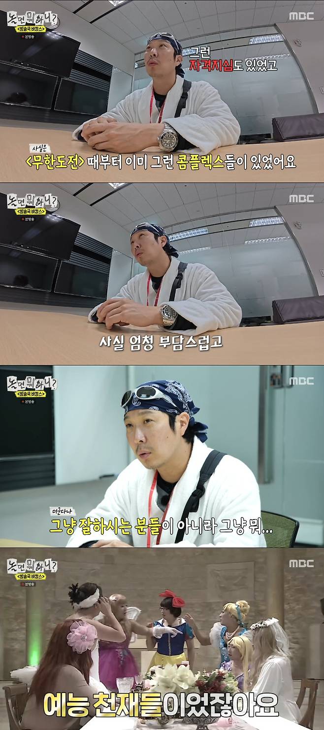 하하는 "그 안에서 제가 감당해야 할 몫들이 부담스러웠다. 그냥 잘하시는 게 아니라 천재들이었지 않냐. 발걸음을 맞춰 가는 것만으로도 벅찼다"며 "저도 알고 있었다. 그 안에서 저는 서포트 역할인걸. 그러다 보니 나도 모르게 자격지심이 심하게 생기더라"고 덧붙였다.