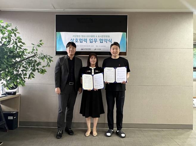 경남스포츠클럽과 유니한방병원이 26일 업무협약을 맺고 지역 스포츠인의 건강관리와 스포츠 재활, 지역주민 대상 건강 프로그램 운영 등 건강증진과 스포츠 활성화를 위한 협력체계를 구축하기로 했다.