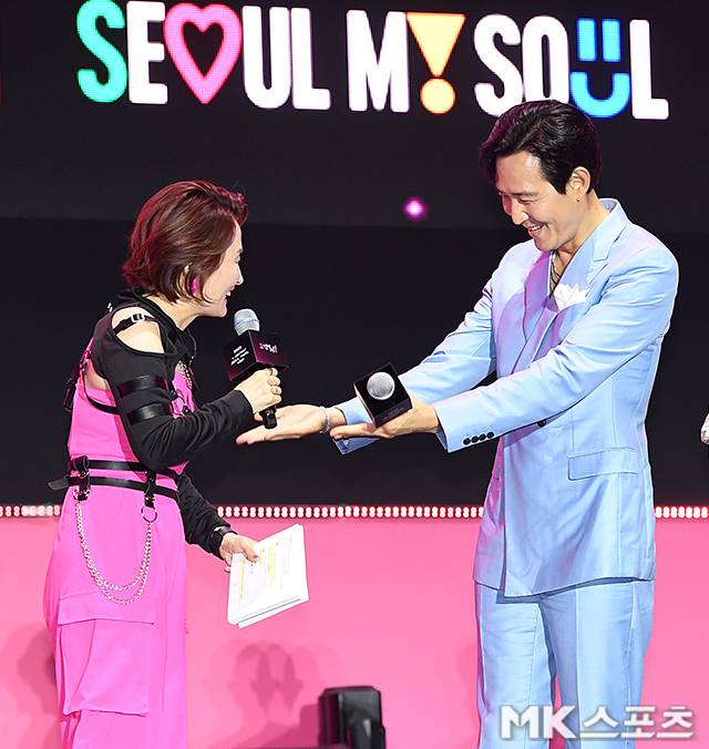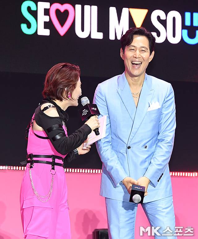 이정재는 등장과 동시에 박경림의 복장을 가리키며 "와 진짜 완벽하다. 너무 잘 어울려요"라며 연신 웃음을 보였다.
