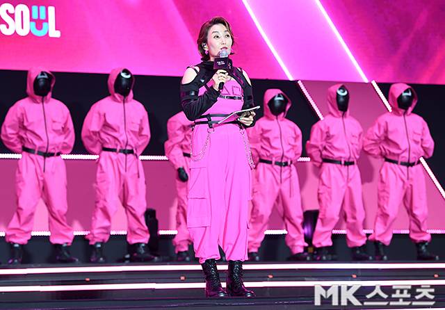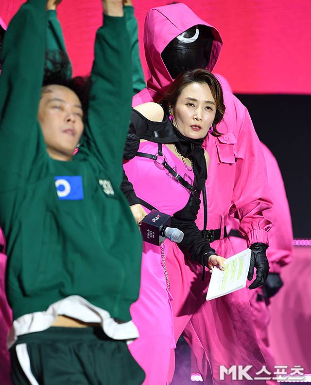 이날 진행을 맡은 박경림은 핑크색 ‘감시자’ 복장을 하고 등장해 현장을 압도했다. 오프닝부터 무대를 장악한 박경림은 MC임에도 불구하고 극 중 콘셉트를 완벽히 살려 팬들의 뜨거운 호응을 받았다.