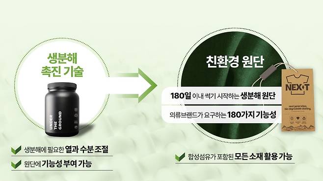 서 대표는 "생분해 친환경 촉진제를 원단 제조 공정에 접목하는 것은 물론 원단을 땅에 묻고 썩는 과정을 1년이라는 긴 시간 동안 연구하며 제품을 개발했다"고 했다.