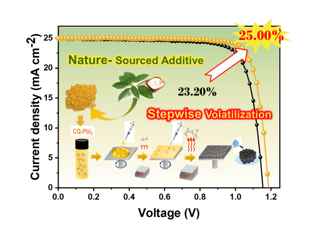 UNIST(울산과학기술원) 에너지화학공학과 양창덕 교수 연구팀은 29일 녹나무에서 추출한 캠퍼(camphor)에 산화 작용기가 결합된 ‘캠퍼퀴논(camphorquinone)’을 첨가제로 사용해 고품질 페로브스카이트 박막을 합성했다고 밝혔다. 해당 기술은 태양전지의 수명과 효율을 동시에 높이면서도 공정을 단순화해 제조 비용을 절감하는 데도 기여할 것으로 보인다.