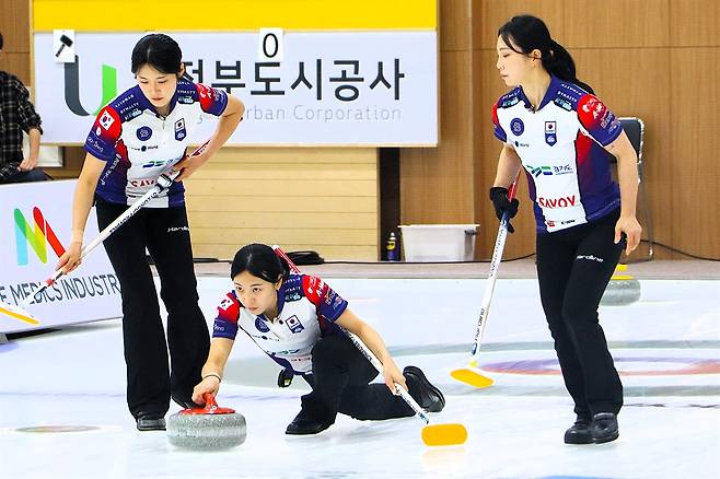 | ▲ 27일 열리 2025 한국컬링선수권대회 여자부 결승전에서 경기도청 선수들이 스톤을 투구하고 있다. 왼쪽부터 설예은·김민지·김수지 선수. |
