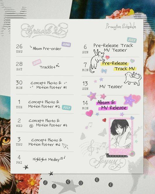 아기자기한 손글씨 느낌과 섬세한 아트워크까지 감성적인 무드를 담은 스케줄러에 따르면 조유리는 오는 30일부터 순차적으로 4개 버전의 콘셉트 포토와 모션 포스터를 공개한다. 이어 하이라이트메들리, 선공개곡 뮤직비디오 및 타이틀곡 뮤직비디오 티저 공개를 거쳐 7월 14일 미니 3집 ‘Episode 25’를 정식으로 발매한다.