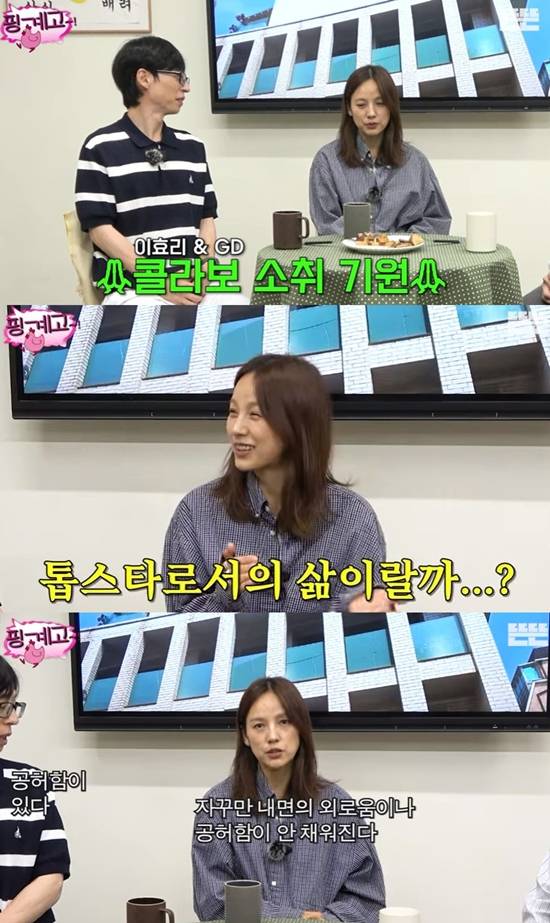 이효리는 "가치관도 중요하지만 삶이 비슷하다. (지디가 '유퀴즈'에서) 돈도 벌어 보고 인기도 많이 얻었지만 내면의 외로움이나 공허함이 안 채워진다고 했는데 저도 그런 면이 있다"며 "공허함이란 건 이유가 없나 보다. 요가도 해보고 제주도에서 일주일에 5일을 보호소에서 봉사도 해봤는데 아직까지 모르겠다. 내 욕심인가"라고 털어놨다.