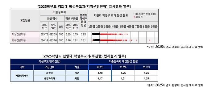 경희대의 경우 50%컷, 70%컷, 합격자 평균 등급과 함께 합격자와 불합격자의 등급 분포도 보여주고 있어 좀 더 명확한 분석이 가능하다. 한양대는 평균 등급만 보여주고 있으나 3개년 자료를 함께 보여주고 있기 때문에 과거 자료를 일일이 찾아야 하는 번거로움을 줄일 수 있다.