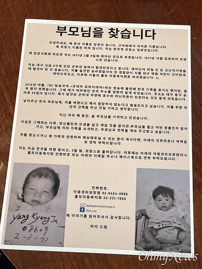 지난 여러 해 동안, 늘 부모님을 기억하고 있었습니다. 지금은 그때와 다른, 당신들만의 인생을 살고 계실 것을 알지만, 부모님을 뵙고 어떤 분들인지 알아 가고, 부모님께 저의 가족을 소개하고, 부모님과 연락을 계속 주고 받고 싶습니다." (마리씨가 직접 만든 '부모님을 찾습니다' 전단지 일부)