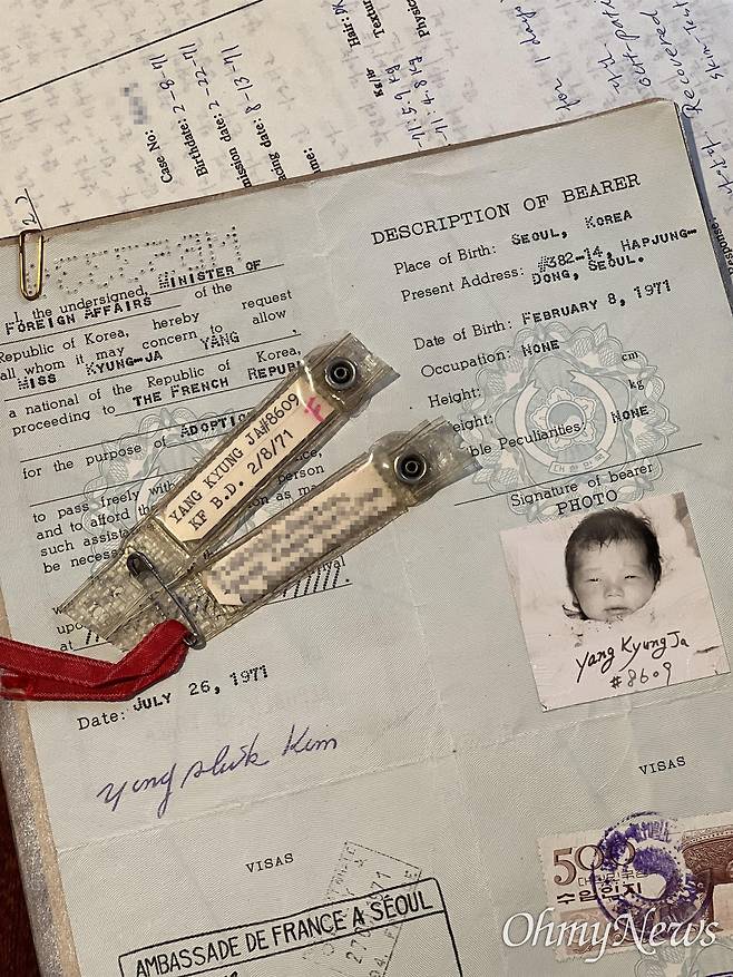 | ▲ 마리씨가 서른 살이 되었을 때, 어머니로부터 받은 서류의 일부. 비자 등 서류에는 마리씨가 한국에서 프랑스로 입양갈 때 당시의 이름과 사진이 담겨있고, 프랑스로 입양을 가기 위해 비자를 받은 일시(1971년 7월 26일)도 나와있다. |