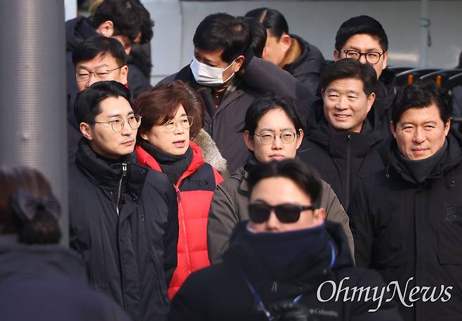 | ▲ 국민의힘 박준태(왼쪽 맨 하단), 김정재, 조지연 등 의원들이 1월 6일 오전 서울 용산구 한남동 대통령 관저 앞에서 공수처의 체포영장 집행을 막기 위해 대기하고 있다. |