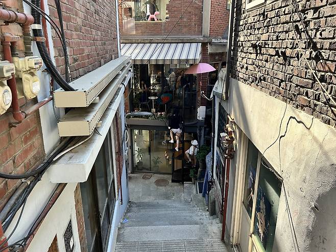 몇 차례 헤매다 간신히 골목을 찾아 내려가니, '와' 소리가 절로 나왔다. 마법 같은 풍경이 거짓말처럼 눈앞에 나타났다. 시간이 멈춘 듯, 옛 모습이 드러난 작은 건물 속에 각양각색의 식당과 카페 등이 빼곡했다. 옷가게와 소품 가게도 있었고 사주를 봐주는 점집도 한 구석에 보였다. 한 사람이 걸어갈 정도로 좁은 골목에 놓인 작은 테이블에는 젊은 남녀가 여유로운 표정으로 와인과 음식을 즐기고 있었다.