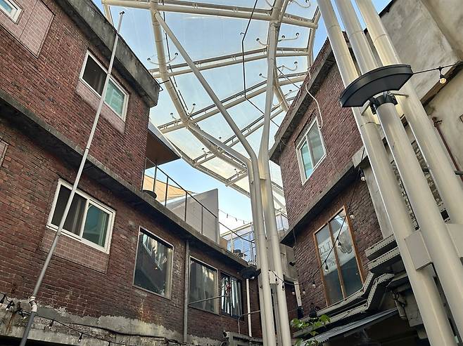 언뜻 보면 유럽이나 홍콩의 골목 같기도 했고, 드라마 세트장처럼 생각이 들 정도였다. 무질서해 보이지만 그래서 더 아기자기하고, 옛 것 같지만 그래서 더 요즘 것 같은. 입에서는 절로 힙하다는 소리가 튀어나왔다. 무엇보다 눈에 띄는 건, 투명 지붕이었다. 자연광은 투과시키고 비를 막아 아늑한 분위기를 조성해 '신의 한 수'라는 생각이 들었다.
