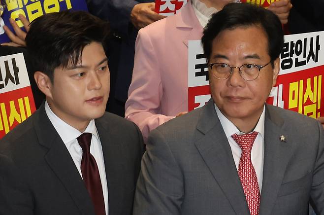 | ▲ 송언석 국민의힘 원내대표(오른쪽)를 비롯한 소속 의원들이 20일 오전 서울 여의도 국회에서 열린 ‘비리백화점 이재명 정부 인사청문회 대책 긴급 의원총회’를 마친 뒤 김민석 국무총리 후보자 지명 철회를 요구하고 있다. |