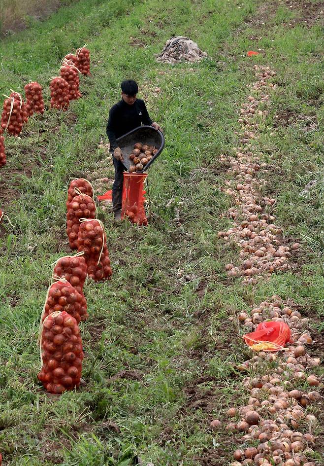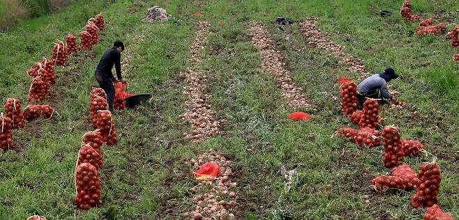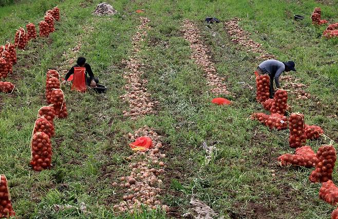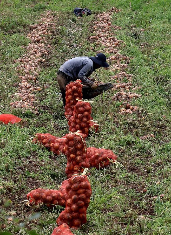 29일 오후 안동시 일직면 양파 재배 농가에서 구슬땀을 흘리며 햇양파를 수확하고 있다. /이용선기자 photokid@kbmaeil.com