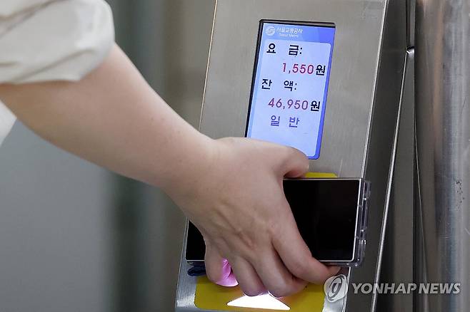 (서울=연합뉴스) 임화영 기자 = 수도권 지하철 기본요금이 일제히 1천400원에서 1천550원으로 오른 가운데 29일 서울 지하철 2호선 을지로입구역 개찰구에서 시민이 교통카드를 찍고 있다. 2025.6.29