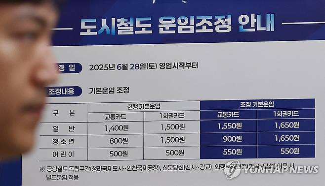 (서울=연합뉴스) 임화영 기자 = 수도권 지하철 기본요금이 일제히 1천400원에서 1천550원으로 오른 가운데 29일 서울 지하철 2호선 을지로입구역에 도시철도 운임조정 안내문이 붙어 있다. 2025.6.29