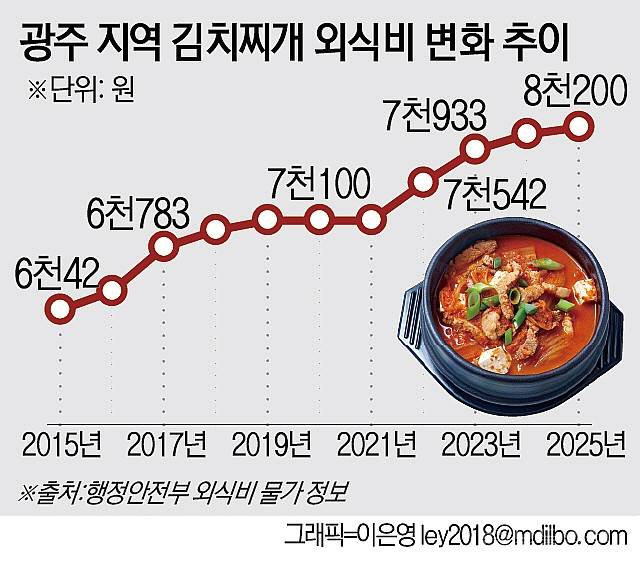 광주에서 김치찌개 백반 가격 평균 8천원 시대가 열렸다. 2024년 1월, 7천800원에서 8천200원(2025년 1월 기준)으로 5.1% 올랐다. 한국소비자원 가격정보종합포털 참가격 조사 결과다. 이들 가격은 광주 평균인 만큼 유명한 식당은 더 비싸다. 한 번 올리면 낮추는 일이 드문 외식 가격 특성상, 1만원 대까지 오르는 것 아니냐는 우려도 나온다. 지난해 '금(金) 배추' 파동의 후과다. 주재료인 배추 가격이 요동치면서다. 최근 빈번해진 폭염·극한 호우·한파 등 이상기후의 영향 탓이다.