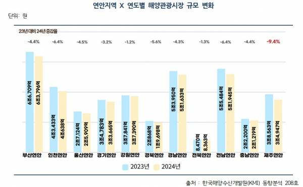 2023년 3조8563억원에서 큰 폭으로 줄어든 수치로, 전국 11개 연안지역 가운데 가장 큰 감소폭이다.