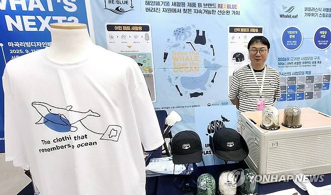 (부산=연합뉴스) 조정호 기자 = 29일 부산 해운대구 벡스코에서 열린 2025 BFAA 국제아트페어에서 사회적기업이 폐어망 등 해양폐기물을 세척과 파쇄 등의 공정을 거쳐 만든 티셔츠, 장갑, 인형 제품을 선보이고 있다. 이 기업은 발달장애인을 채용해 폐플라스틱 등 버려진 자원에서 새로운 가치를 찾는 업사이클링 사업을 추진하고 있다. 2025.6.29