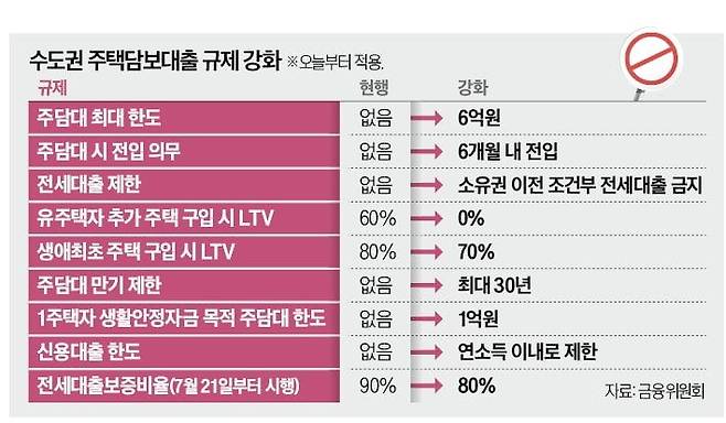 이번 대출 규제는 형식뿐 아니라 내용면에서도 파격적이라는 평가를 받는다. 시장에선 “문재인 정부 5년간 시행했던 모든 대출 규제를 한 번에 꺼내든 격”이라는 분석이 나온다. 이번 대출 규제가 과거와 비교할 수 없을 정도로 매우 강력하다는 의미다. 수도권 주담대 대출 최대 한도 6억원, 정책대출 한도 감축 등은 사상 처음으로 시행됐다.