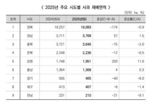 통계청이 29일 발표한 2025년 재배면적조사 결과에 따르면 강원자치도의 사과 재배면적은 지난해보다 203㏊(11.6%)가 늘어난 1,951㏊로 집계됐다.