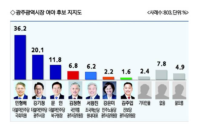 여야 광주시장 후보군 지지도 조사에서는 36.2%를 얻은 더불어민주당 민형배 국회의원이 20.1%에 그친 같은 당 강기정 시장을 16.1%p 크게 앞서며 선두를 차지했다.