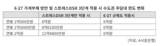 여기에 7월 1일부터 스트레스 총부채원리금상환비율(DSR) 3단계가 시행되면서 은행별로 대출금리와 대출방식(고정형·변동형)에 따라 연봉 1억원 안팎의 직장인부터 주담대 한도가 6억원으로 제한될 예정이다.