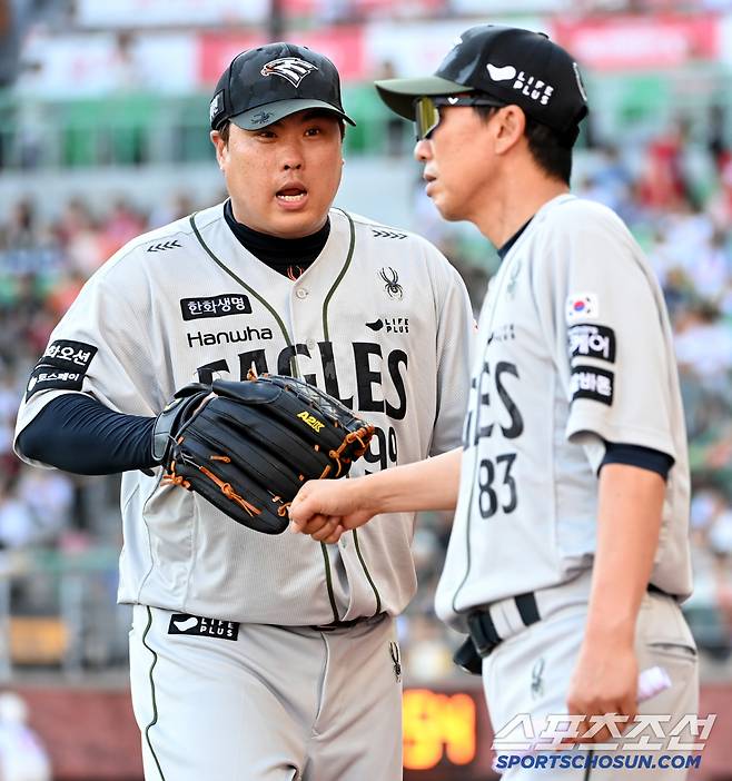 29일 인천SSG랜더스필드에서 열린 한화와 SSG의 경기, 3회말 투구를 마친 류현진이 더그아웃으로 향하고 있다. 인천=허상욱 기자wook@sportschosun.com/2025.06.29/