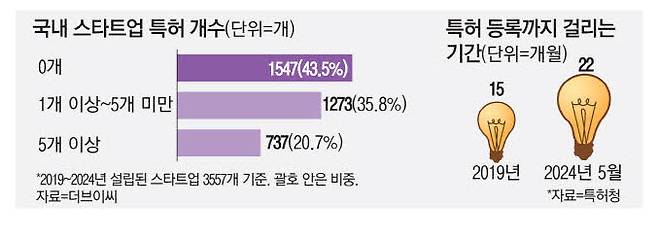 29일 벤처투자정보 플랫폼 더브이씨에 따르면 2019년부터 지난해까지 설립된 국내 스타트업 3557곳 중 43.5%에 달하는 1547곳이 특허가 단 1개도 없었다.