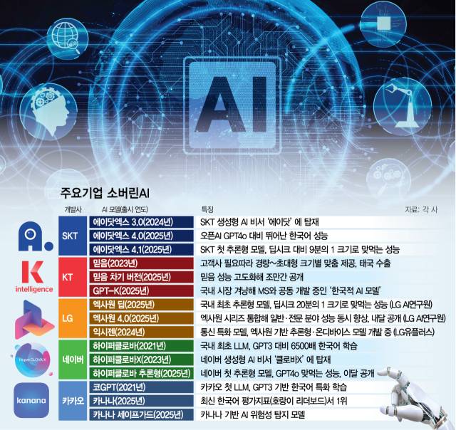 SK텔레콤(017670)이 차기 인공지능(AI) 모델 기반 서비스를 처음으로 선보였다. 글로벌 빅테크에 맞서 그동안 자체 개발해온 차기 모델 상용화에 본격적으로 나서는 한편 구형 모델을 업계에 개방하고 국산 AI반도체까지 도입하며 기술 자립도를 높이려 하고 있다. 이재명 정부의 ‘AI 3강’ 전략이 외세에 맞선 국산 AI, 이른바 ‘소버린(자립형) AI’ 지원에 초점을 맞추면서 SK텔레콤은 물론 KT(030200)·LG(003550)·네이버·카카오(035720) 등 대기업들도 앞다퉈 맞춤 대응책을 펼치고 있다.