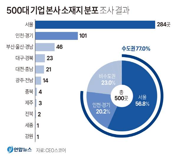 기업데이터연구소 CEO스코어에 따르면 국내 500대 기업 본사 소재지를 조사한 결과 서울에만 절반을 훌쩍 넘는 56.8%(284곳)에 소재하고 있는 것으로 나타났다.