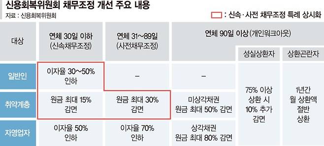 30일부터 상환능력이 매우 열악한 취약계층이 90일 이상 장기 연체할 경우 최대 원금 감면 폭을 종전 30%에서 50%로 확대한다. 연체 중인 자영업자에 대해서도 연체 기간에 따라 최대 80%까지 원금 감면 폭을 늘린다. 채무조정을 받은 후 75% 이상 채무를 성실히 상환했다면 잔여 채무액의 10%를 추가로 감면받는다.