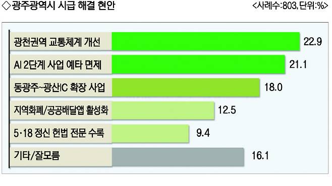먼저 가장 시급히 해결해야 할 현안을 묻는 질문에 '광천권역 교통체계 개선'(22.9%), '인공지능(AI) 2단계 사업 예타면제'(21.1%), '호남고속도로 동광주IC~광산IC간 확장'(18.0%) 등 순으로 꼽았다.