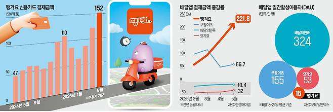 29일 대체 데이터 플랫폼 한경에이셀(Aicel)에 따르면 땡겨요의 지난달 신용카드 결제금액(보정치)은 총 152억원이다. 전년 동월 대비 221.8% 급증해 월간 기준 역대 최대치를 기록했다. 국내 배달앱 시장에서 배달의민족 요기요 등 경쟁사 점유율을 빠르게 잠식하고 있다는 분석이 나온다.