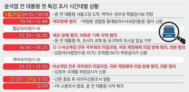 윤석열 전 대통령이 28일 조은석 내란 특별검사팀의 첫 조사에서 체포 방해 지시 혐의 관련 신문을 거부하고 나선 건 특검의 구속영장 청구를 염두에 둔 행보로 해석된다. 앞서 내란 특검은 윤 전 대통령이 올해 1월 고위공직자범죄수사처(공수처)의 체포영장 집행 시도 당시 대통령경호처에 체포 방해를 지시한 혐의 등을 기재해 체포영장을 청구했다. 윤 전 대통령이 평생 검찰에 몸담으며 수사를 지휘하던 경찰에게 신문을 받는 게 적절치 않다고 생각해 반발한 것이란 분석도 나온다.