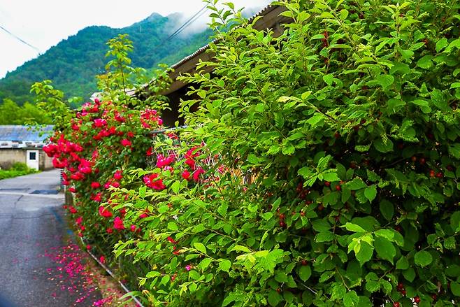 | ▲ 선평마을 마실 나들이 앵두나무와 장미. 마을 곳곳이 포토존이다 |