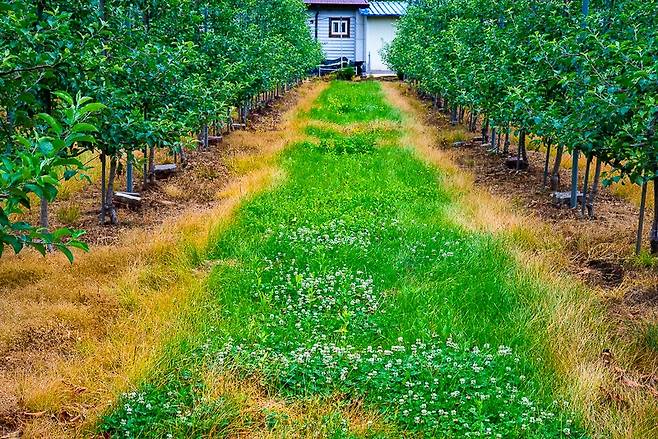 | ▲ 선평마을 마실 나들이 과수원밭 토끼풀도 정갈하다 |