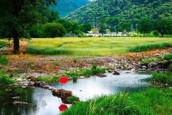 마을을 내려오니 다시 청보리밭이다. 그 사이 뭔 일이 있었던 걸까? 더 아름다워 보인다. 지장천 속섬 청보리밭으로 가는 작은 돌다리가 딱 포토존이라 모델 대신 우산을 놓고 촬영해보았다. 여행은 혼자여서 더 아름다울 때도 있는 모양이다.