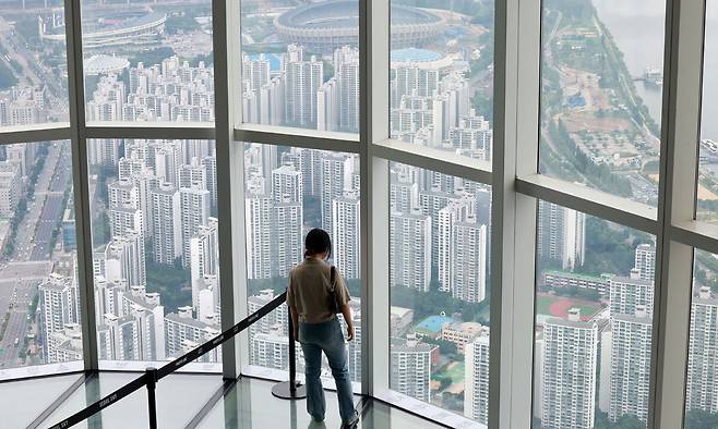 | ‘불장’ 잡힐까… 신규 매수 문의 뚝 부동산 조사업체 부동산R114는 6억원 이상 주택담보대출을 금지하는 정부의 초고강도 대출 규제로 서울 전체 25개 구 가운데 18개 구의 대출액이 종전보다 줄어들 것이라고 29일 분석했다. 사진은 이날 서울 송파구 롯데월드타워 전망대 서울스카이에서 바라본 서울 시내 아파트 단지 모습. 연합뉴스 |
