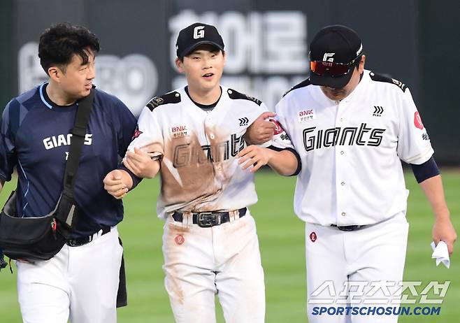 29일 부산 사직구장에서 열린 롯데와 KT의 경기. 7회 김상수의 뜬볼을 잡는 과정에서 부상을 당한 박찬형이 교체되고 있다. 부산=송정헌 기자songs@sportschosun.com/2025.06.29/